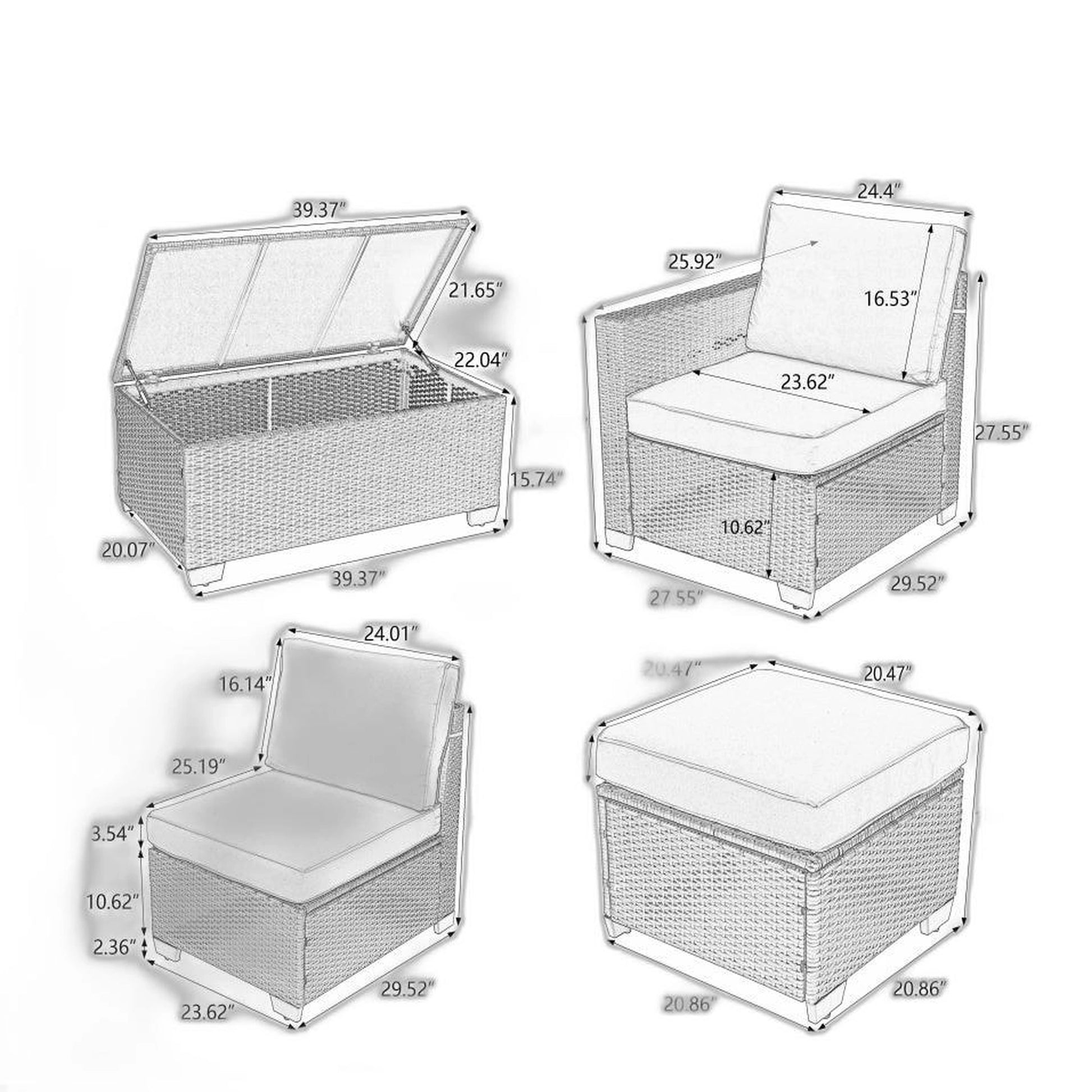 | 2xSingle Chair: W31.5’xD29.52’xH27.55’ 2xL Corner Chair: W27.55’xL29.52’xH27.55’ 2xR Corner Chair: W27.55’xL29.52’xH27.55’ 1x Armless Chiar: W23.62’xL29.52’x27.55’ 1xCoffee Table: L39.37’xW21.65’x15.74’ ...